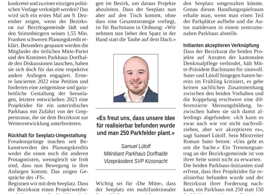 Der Bezirk Küssnacht prüft aktuell mögliche Varianten zur Verbesserung der Parkierungssituation im Dorfzentrum. Unterstütze jetzt aktiv das Parkhaus Dorfhalde, indem du an der Umfrage vom Bezirk Küssnacht teilnimmst. Bei der Fragen welche Parkhaus-Variante bevorzugt werden soll, kann das Parkhaus Dorfhalde ausgewählt werden.